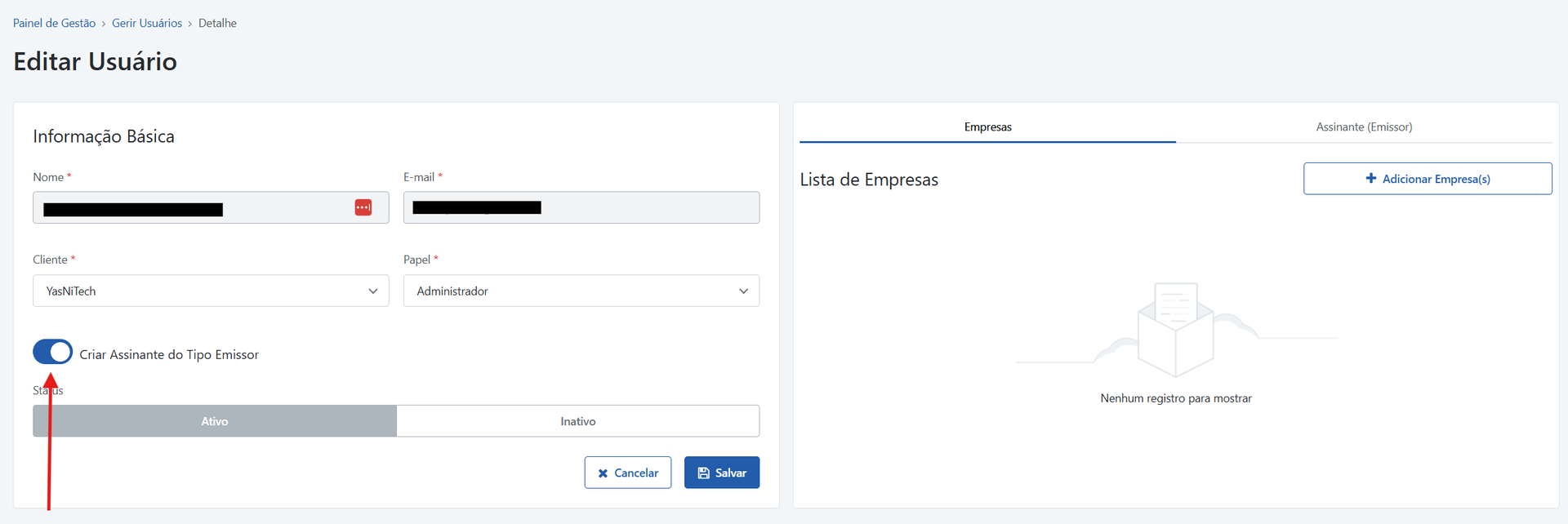 Agora, o usuário criado com a opção ativada para "Criar Assinante do Tipo Emissor" é automaticamente registrado como assinante emissor no Front Office.